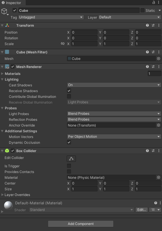 인스펙터 창을 통해 확인할 수 있는 큐브 오브젝트의 컴포넌트 들이다.