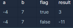 - 예제 1번에서 flag가 true이므로 a + b = (-4) + 7 = 3을 return 합니다.