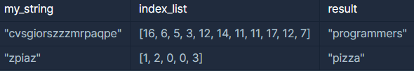 - 예제 2번의 my_string에서 인덱스 0, 1, 2, 3에 해당하는 글자는 각각 z, p, i, a이므로 my_string에서 index_list에 들어있는 원소에 해당하는 인덱스의 글자들은 각각 순서대로 p, i, z, z, a입니다. 따라서 "pizza"를 return 합니다.