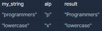 - 예제 1번의 my_string은 "programmers"이고 alp가 "p"이므로 my_string에 모든 p를 대문자인 P로 바꾼 문자열 "Programmers"를 return 합니다.