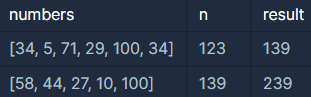 - 139는 n 값인 139보다 크지 않고 마지막 원소인 100을 더하면 139보다 커지므로 239를 return 합니다.