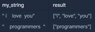 - 예제 1번의 my_string은 " i love you"로 공백을 기준으로 단어를 나누면 "i", "love", "you" 3개의 단어가 있습니다. 따라서 ["i", "love", "you"]를 return 합니다.