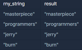 - 예제 4번의 rny_string에는 'm'이 없습니다. 따라서 rny_string 그대로인 "burn"를 return 합니다.